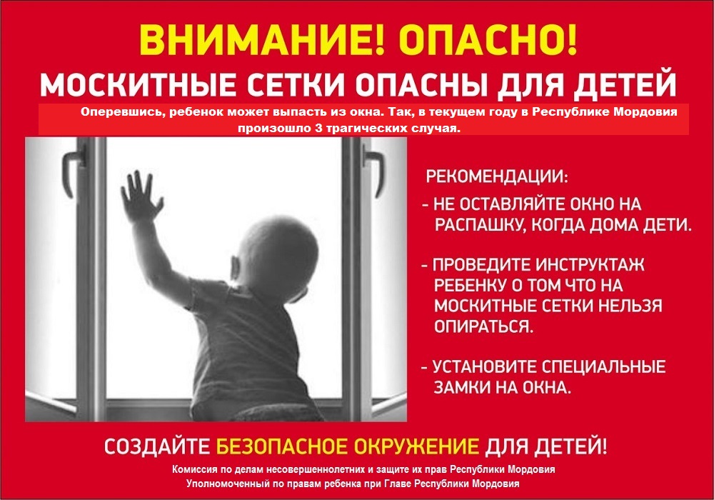 «Угроза выпадения ребенка из окна»! Не оставлять окна открытыми, если дома маленький ребенок, поскольку достаточно отвлечься на секунду, которая может стать последним мгновением в жизни ребенка или искалечить её навсегда. Не использовать москитные сетки без соответствующей защиты окна – дети любят опираться на них, воспринимая как надёжную опору, а потом выпадают вместе с ними наружу. Не оставлять ребенка без присмотра, особенно играющего возле окон и стеклянных дверей. Не ставить мебель поблизости окон, чтобы ребёнок не взобрался на подоконник и не упал вниз. Не следует позволять детям прыгать на кровати или другой мебели, расположенной вблизи окон. • Не следует класть вещи в беспорядке в процессе уборки возле балконных или межкомнатных остеклённых дверей, так как ребёнок может споткнуться и нанести себе травму.