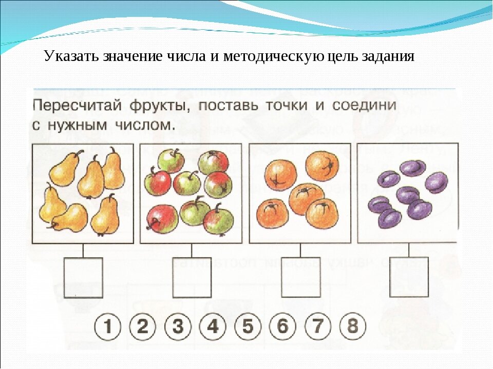закрепить навыки количественного и порядкового счета в пределах 10, умение называть смежные числа заданного числа. Учить находить определённое количество предметов соответствующей цифре, сравнивать предметы по количеству, закрепить навыки прямого и обратного счета, закрепить умение классифицировать предметы по двум признакам, упражнять в знании числительных до 10, умение называть продукты и описывать их .